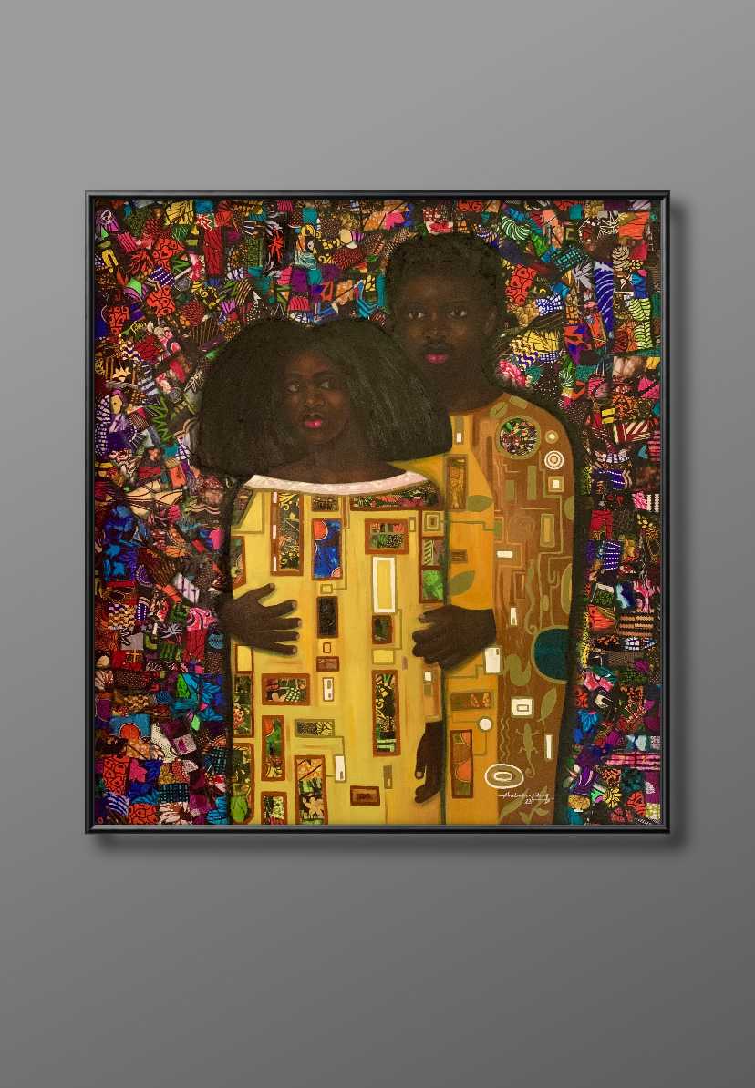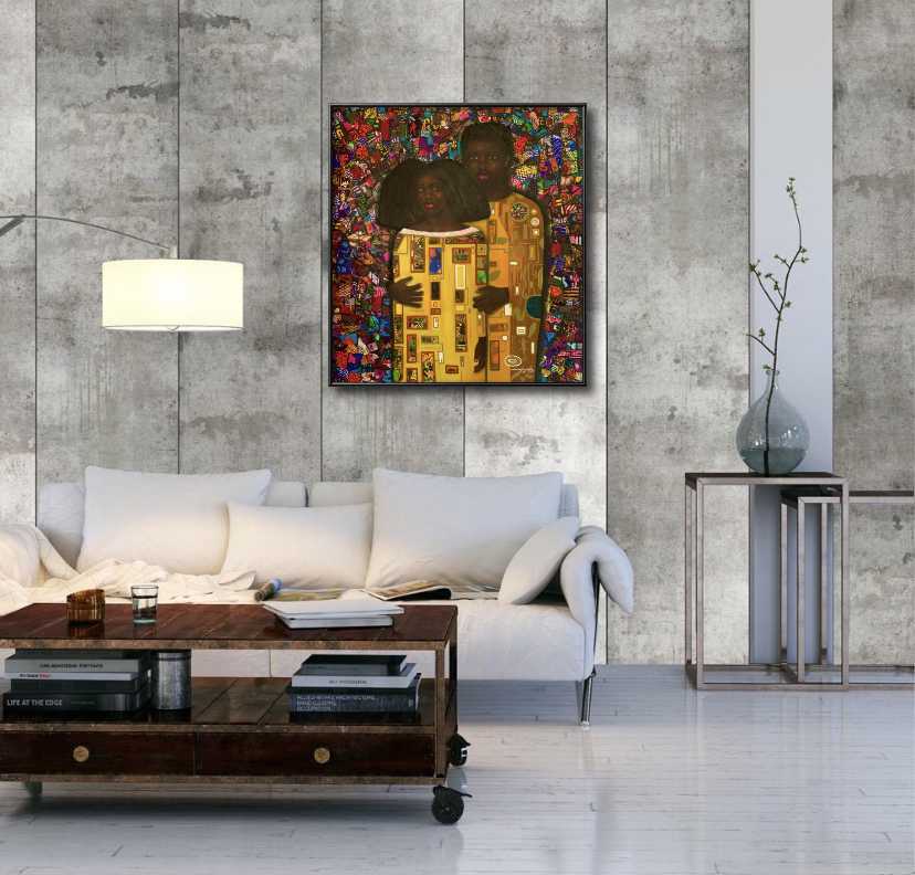 "Eternity's Embrace" is a celebration of love and heritage, a fusion of artistic influences from different corners of the world, uniting in a powerful portrayal of black African love. This masterpiece stands as a testament to the universality of love and the strength derived from embracing one's cultural identity. In a world where love and unity are cherished, this painting serves as a beacon of hope, reminding viewers of the beauty that arises when two souls find solace in each other's arms.