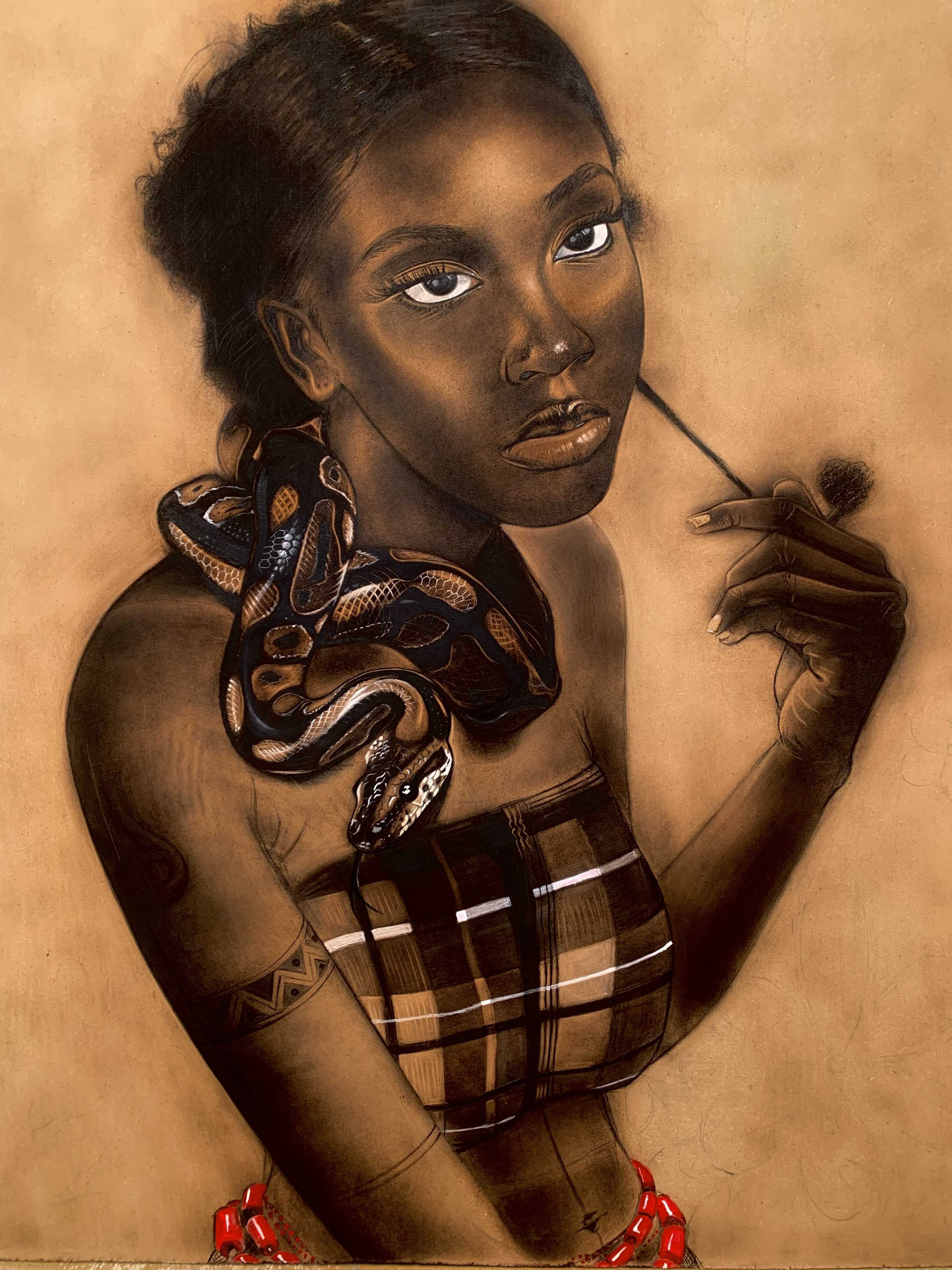 my works are to express African philosophy in five branches which is logic,Aesthetic,metaphysics, ethics,and epistemology using pyrography drawing as a tool for communication.