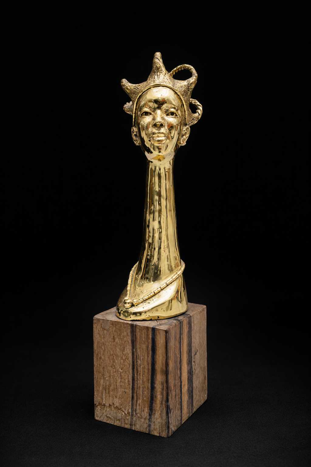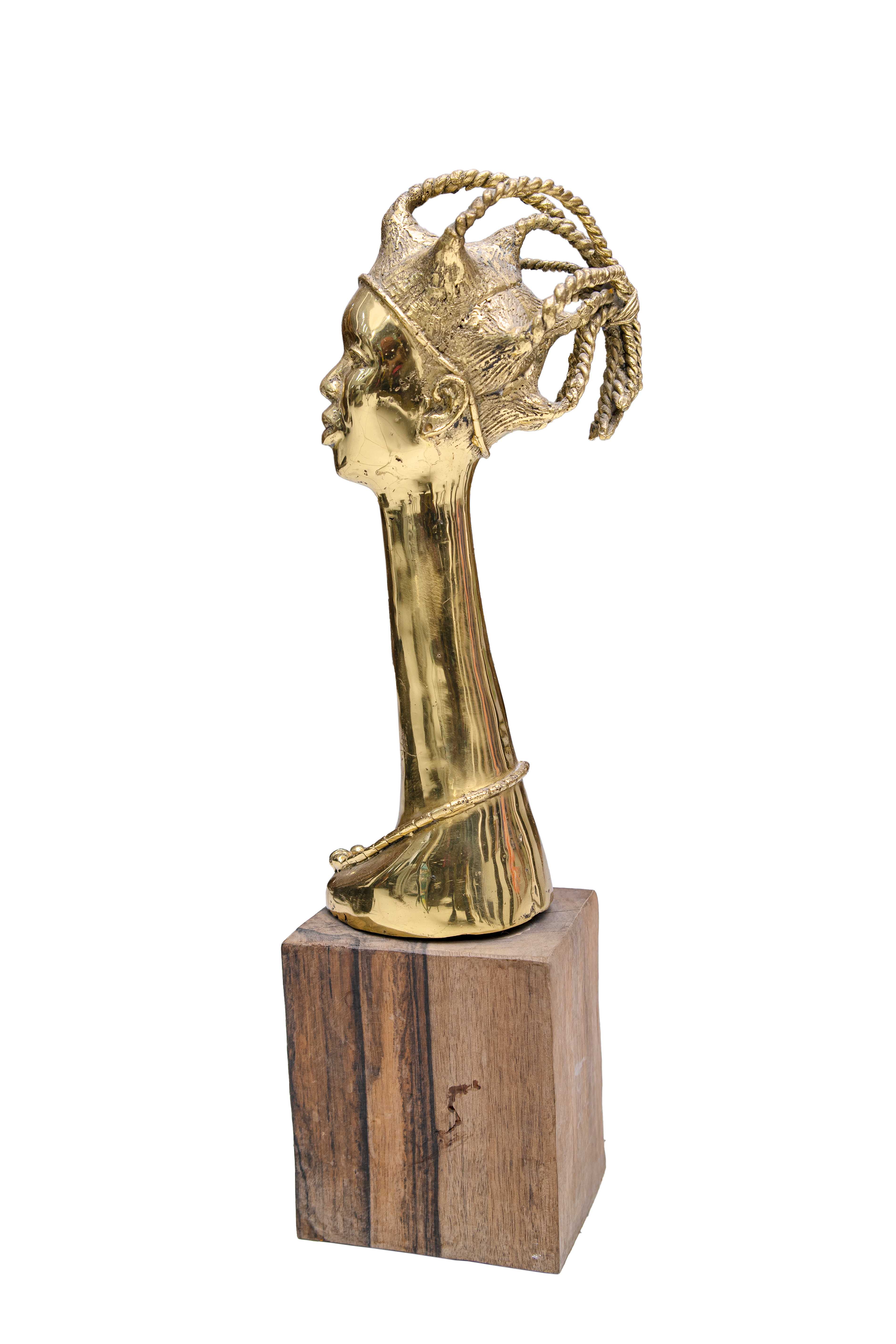 ‘Woman In Beauty’ is a striking sculptural piece that celebrates the elegance, poise, and cultural heritage of the African woman. Crafted with a brilliant, highly polished gold-toned finish, the bust features a dramatically elongated neck that exudes a sense of regal grace and spiritual elevation. The subject's face is rendered with serene, thoughtful features, topped by an intricately detailed, sculptural braided hairstyle that pays homage to traditional African artistry. A delicate, sculpted beaded necklace rests gracefully at the base of her neck, adding a subtle touch of adornment.