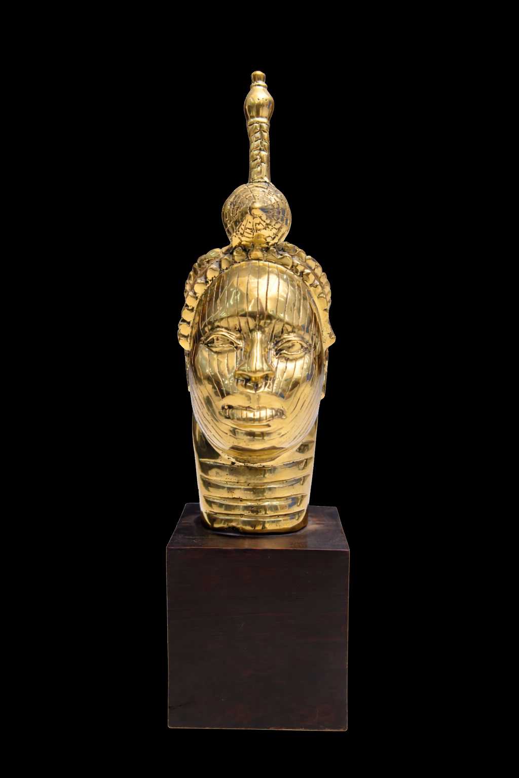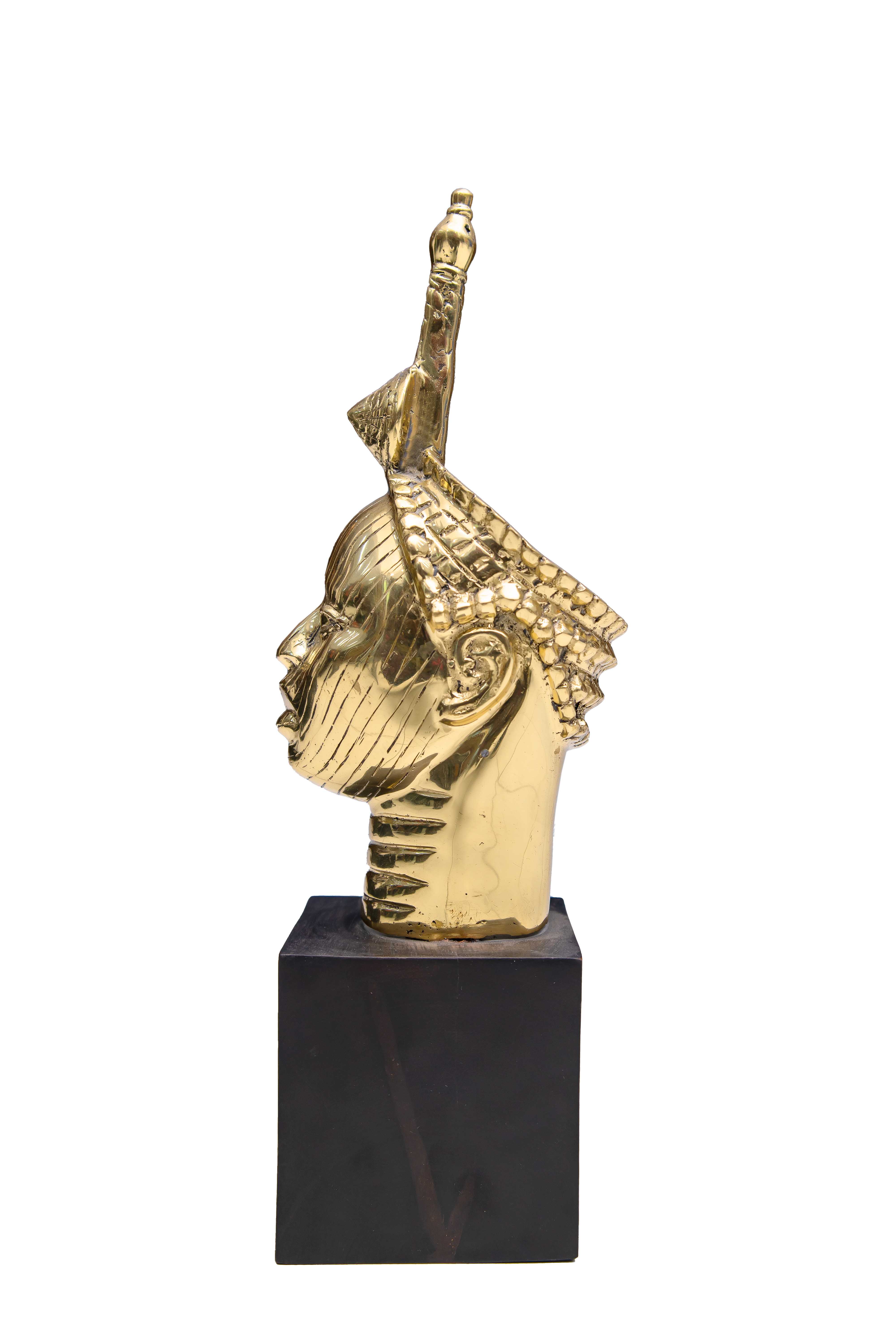 ‘Oti Olokun' is a striking, highly polished metallic sculpture that serves as a magnificent homage to the classical portraiture of the Yoruba people. Gleaming with a brilliant, reflective finish, the bust features the iconic vertical facial scarification (striations) characteristic of ancient Ife artistry. The figure is crowned with an elaborate, towering headdress and adorned with stylized neck rings, traditional symbols of royalty, spiritual depth, and earthly prosperity. This piece stands as a commanding centerpiece, radiating serenity and ancestral power.