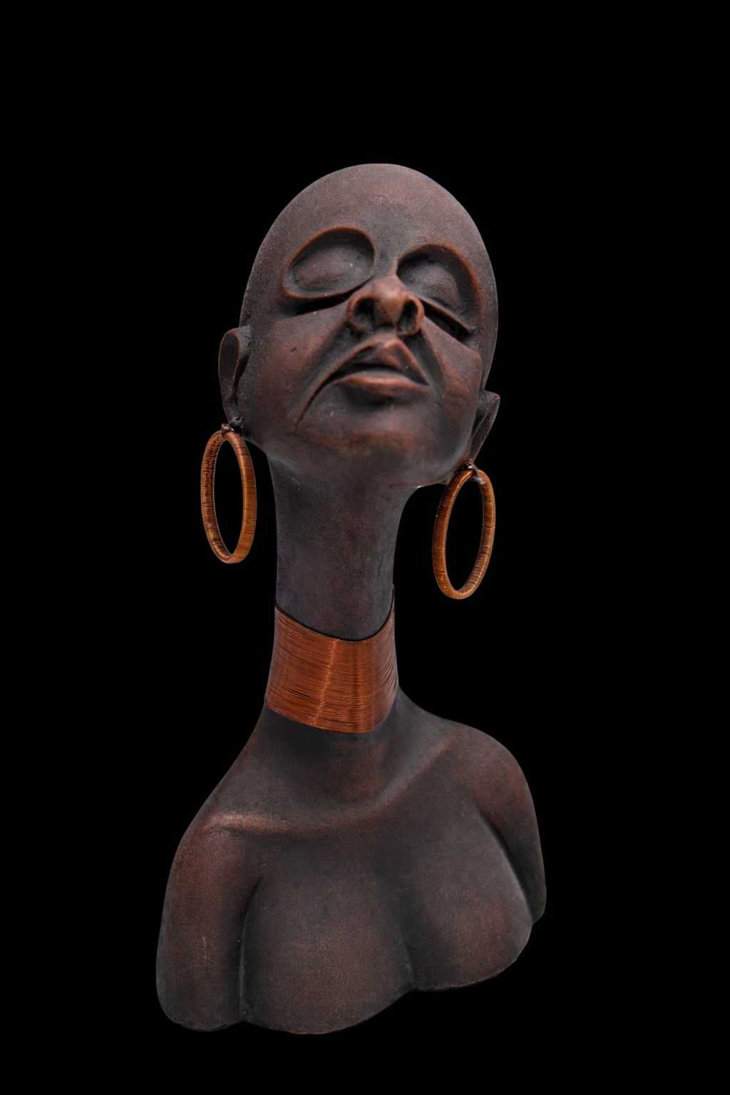 ‘Happy Thoughts,’ is a striking sculptural bust that captures the pure essence of inner peace and quiet joy. This elegant piece features a stylized figure with an elongated neck, graceful posture, and a serene, upturned face. With eyes gently closed in quiet reflection, the sculpture perfectly embodies the tranquil retreat into one's own mind.Crafted with a rich, dark patina that evokes the warmth of aged bronze or earth, the artwork is beautifully contrasted by intricate, copper-toned wire wrapping that forms a striking choker and bold hoop earrings. This captivating artwork draws the eye and invites moments of calm, mindfulness, and reflection into any environment.